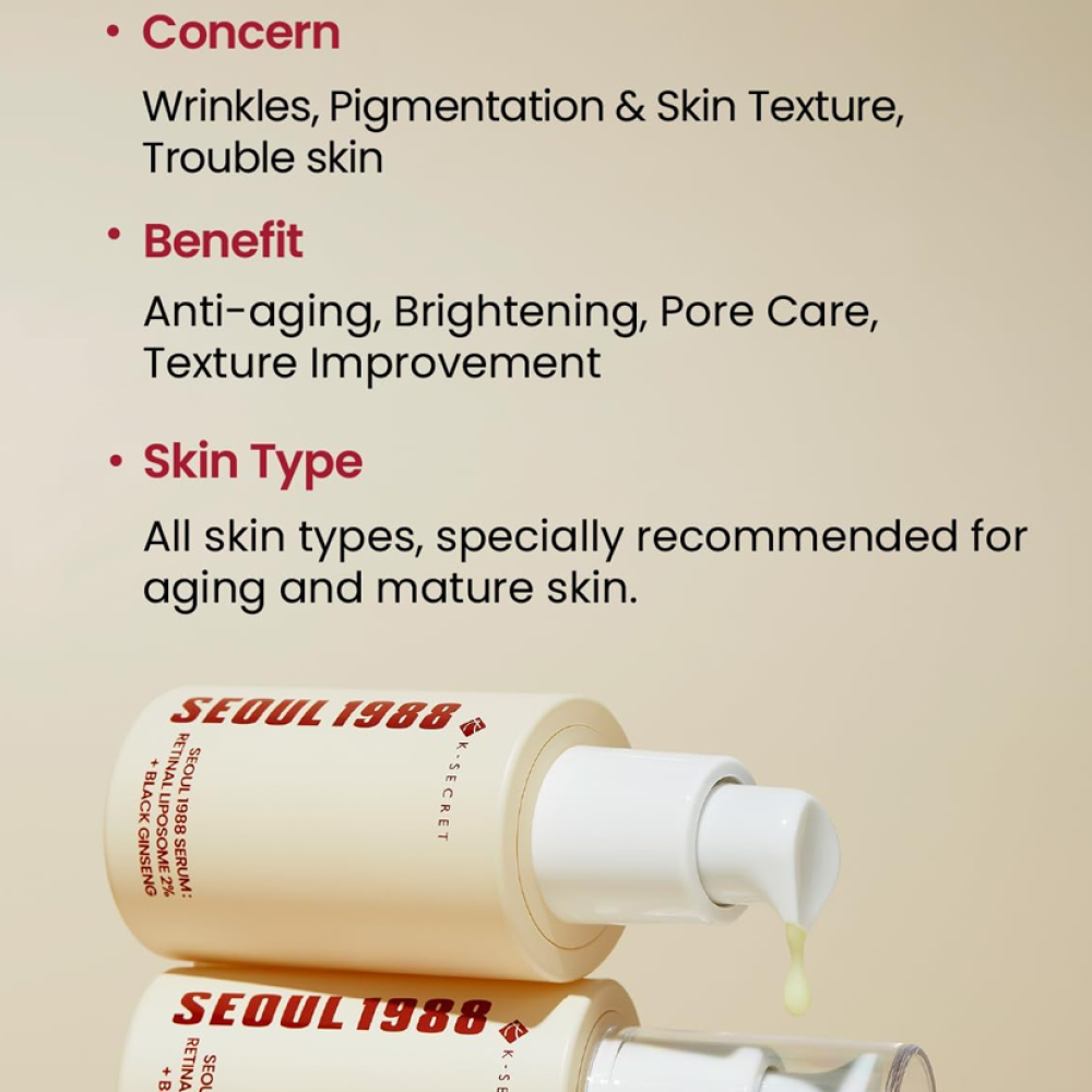 امنحي بشرتك العناية الليلية الفاخرة مع سيروم سيول 1988 من كي سيكريت، بتركيبته المتطورة التي تجمع بين الريتينال النقي والجينسنغ الأسود المخمّر. يعمل هذ...
