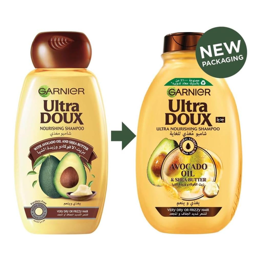 دلّلي شعرك الجاف مع شامبو غارنييه الترا دوكس بزيت الأفوكادو وزبدة الشيا، المصمم خصيصًا لتغذية وتنعيم الشعر الجاف والمتطاير.