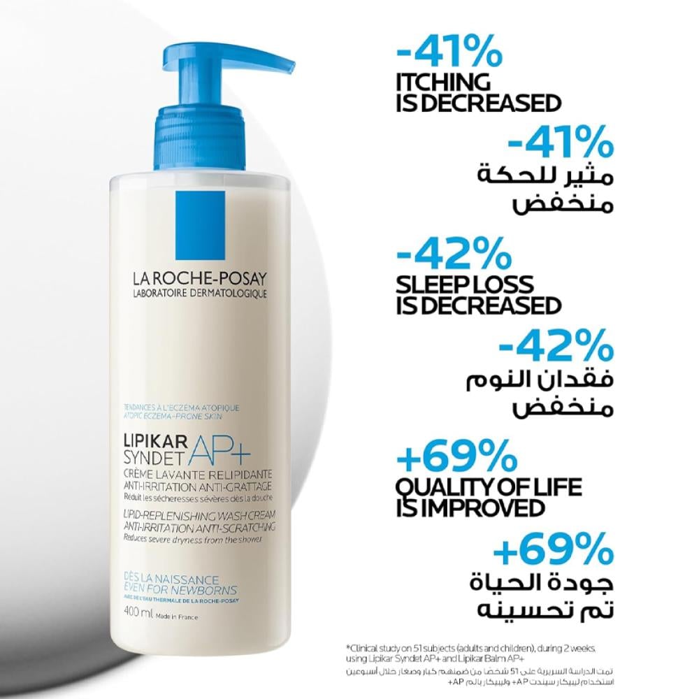غسول كريمي ليبيكار سيندت AP+ من لاروش بوزيه هو غسول لطيف ومغذي مصمم خصيصًا للبشرة الجافة والحساسة جدًا، بما في ذلك البشرة المعرضة للأكزيما. ينظف البشرة بلطف دون إزالة الزيوت الطبيعية، ويحافظ على توازن الحاجز الواقي للبشرة. تركيبته الكريمية تغذي البشرة وتمنحها شعورًا بالراحة والنعومة بعد الاستحمام.