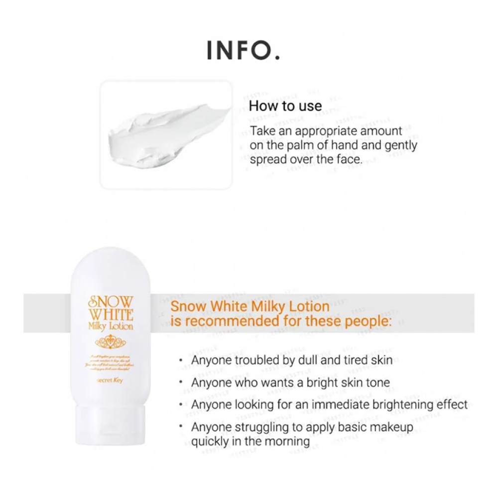 احصلي على بشرة أكثر إشراقًا ونعومة مع لوشن سنو وايت من سيكرت كي، بتركيبة غنية بالحليب والنياسيناميد لتفتيح وتوحيد لون البشرة بشكل طبيعي وآمن.
