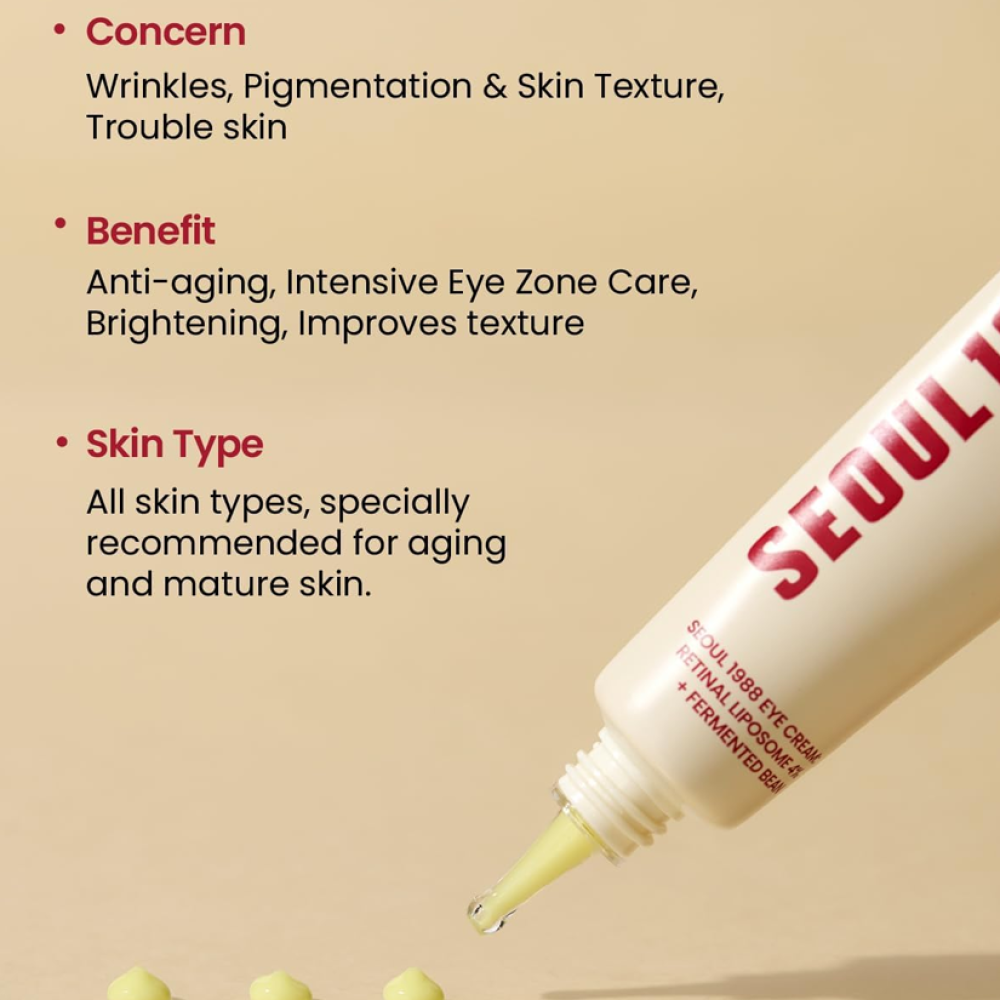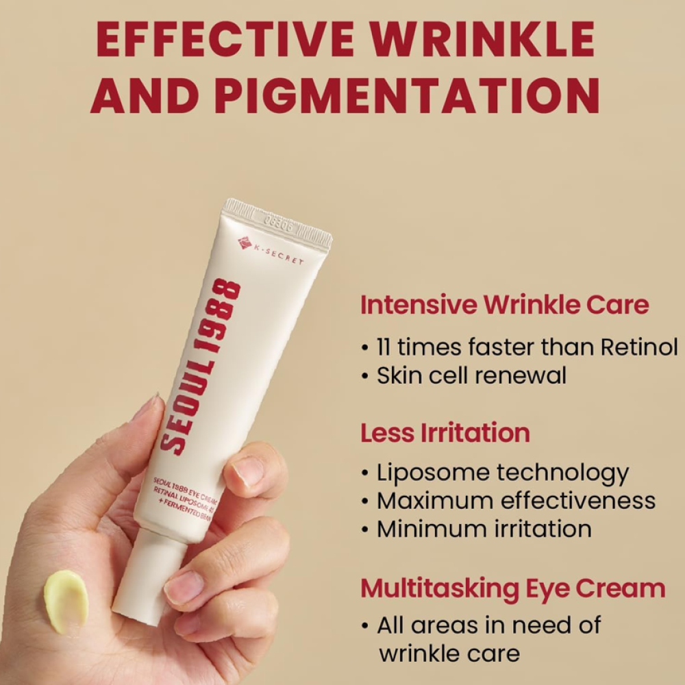 دلّلي محيط عينيكِ بعناية مركّزة مع كريم العين سيول 1988 من كي سيكريت، بتركيبة فعالة تحتوي على 4% من الريتينال المغلف بتقنية الليبوسوم، بحجم 30 مل. هذه التقنية تعزز امتصاص المكونات وتقلل التهيج، مما يجعله خيارًا مثاليًا للبشرة الحساسة حول العين.