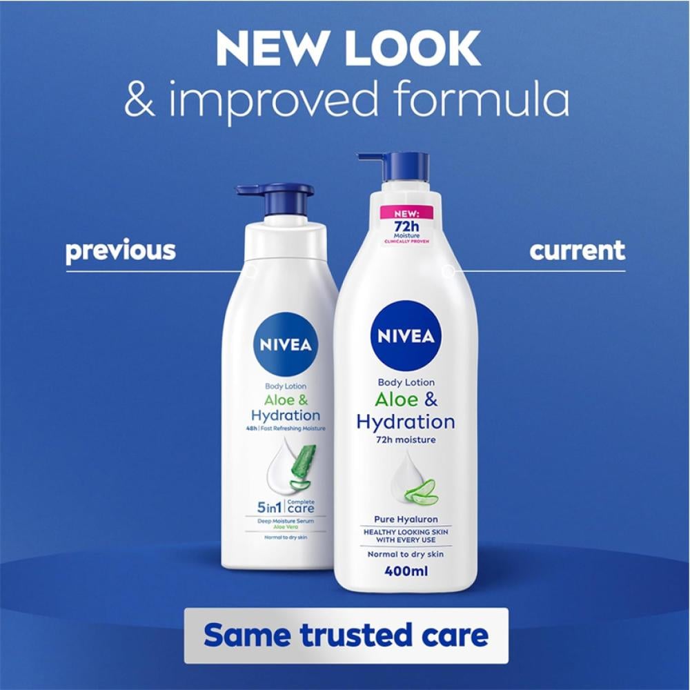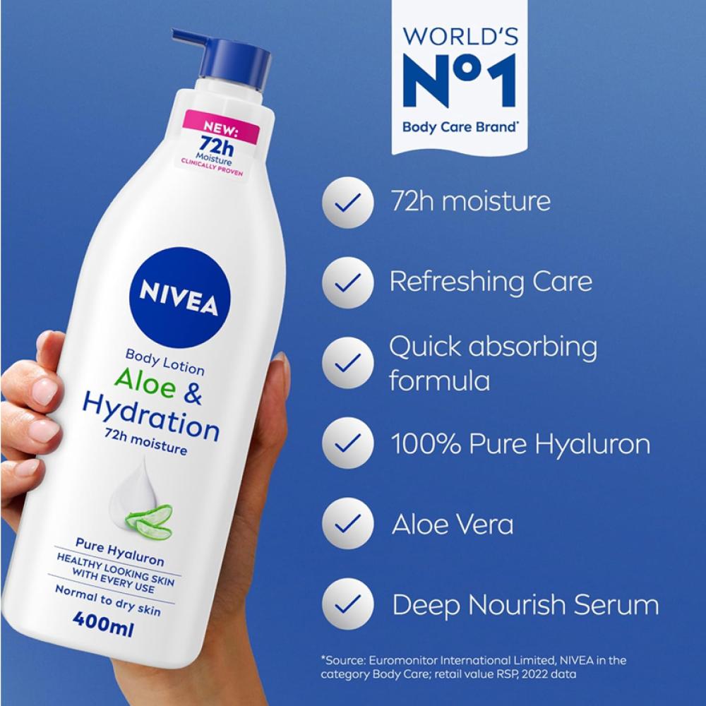A hydrating body lotion by Nivea enriched with Deep Moisture Serum and Aloe Vera to deeply moisturize normal to dry skin, leaving it soft, smooth, and non-greasy all day.