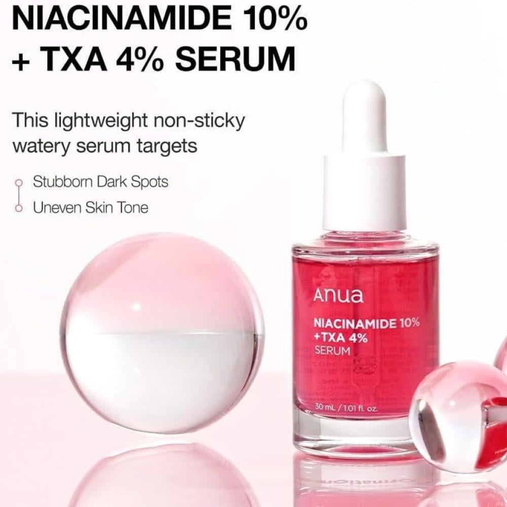 Anua Niacinamide 10% + TXA 4% Serum is a powerful formula designed to fade dark spots, hyperpigmentation, and post-acne marks. With brightening Niacinamide and Tranexamic Acid, it helps restore clarity and evenness to the skin.
