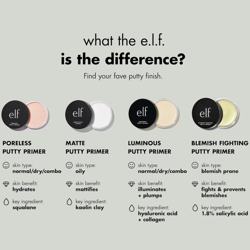 Start your makeup with a smooth base using the e.l.f. Poreless Putty Primer – 21g. This creamy formula minimizes pores and fine lines while gripping m...