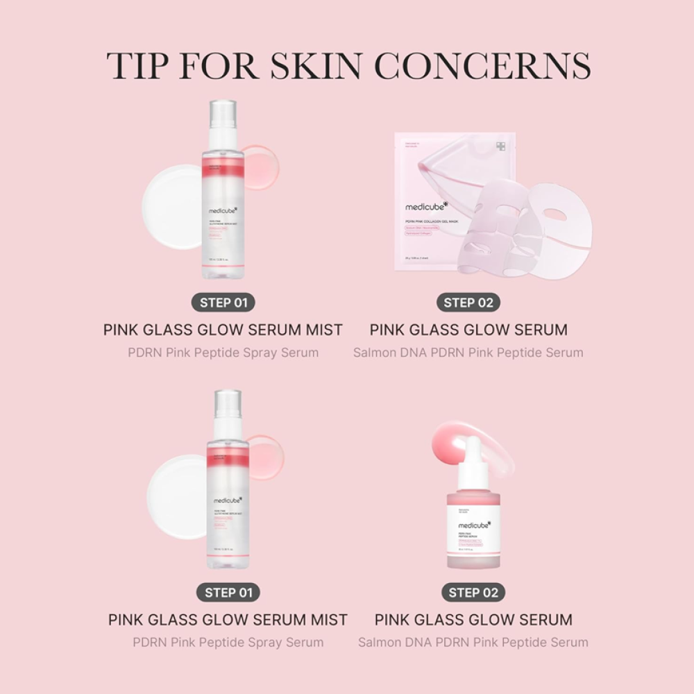 Medicube PDRN Pink Glutathione Serum Mist 100ml hydrates, brightens, and firms skin. Lightweight formula with PDRN and Glutathione helps even skin tone, refreshes, and improves texture.